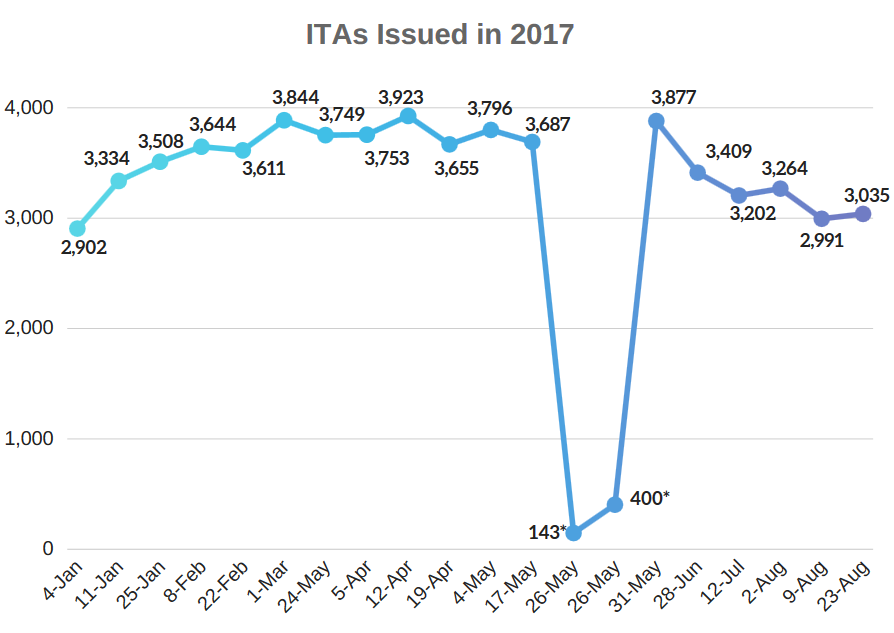 The latest draw brings the number of ITAs issued so far this year to 63,777, a far higher figure than the total for the whole of 2016. Indeed, nearly half of all ITAs issued since Express Entry was first launched in January, 2015 have been issued in 2017.