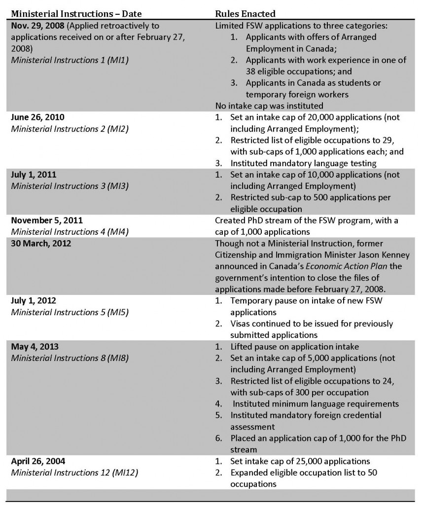 Ministerial Instructions are usually put into place for a limited period of time. They have been issued for a number of immigration programs. However, perhaps nowhere has their impact been felt as strongly as in the FSW program.