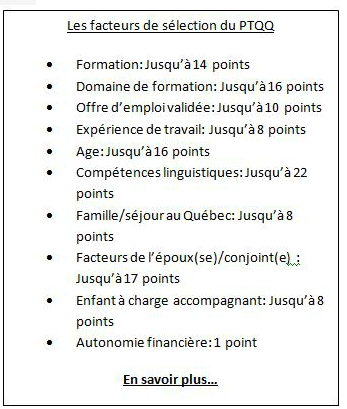 Le PTQQ est basé sur un système de points attribués selon les caractéristiques du candidat tels que sa scolarité, son expérience de travail, son âge, ses compétences linguistiques, ses liens avec le Québec (visites ou famille au Québec), les facteurs de capital humain du conjoint du demandeur (le cas échéant), et si oui ou non le demandeur dispose d'une offre d'emploi validée au Québec. Si une personne atteint les minimums requis pour ces facteurs, il ou elle peut alors obtenir des points supplémentaires pour ses enfants à charge qui l’accompagnent. Les candidats doivent noter qu'une offre d'emploi n’est pas nécessaire pour le PTQQ.
