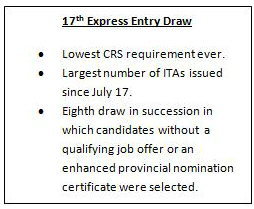 A landmark moment in the history of the Express Entry selection system for Canadian immigration took place on September 18, when Citizenship and Immigration Canada (CIC) issued Invitations to Apply (ITAs) for Canadian permanent residence to candidates with Comprehensive Ranking System (CRS) scores of 450 and above. This is the lowest CRS points requirement so far this year.