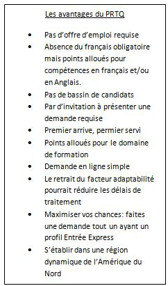 Actuellement, le PRTQ fonctionne sur la base du premier arrivé, premier servi. Le Ministre de l'Immigration du Québec a récemment proposé un projet de loi qui, s’il est adopté, entraînerait probablement au Québec la mise en œuvre d'un système d’'immigration semblable au système Entrée Express actuellement utilisé par le gouvernement du Canada et par lequel les candidats devraient faire une «déclaration d'intérêt» avant d'être invité à faire une demande sur la base de leurs qualifications.