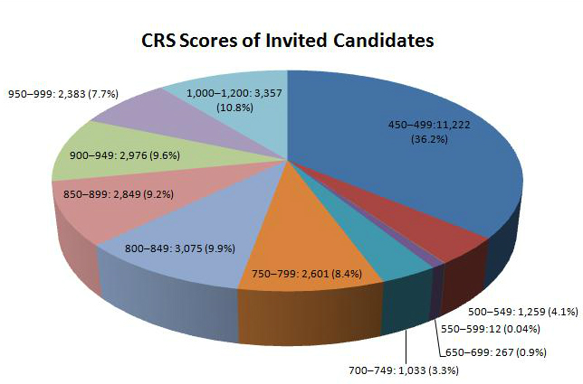 Candidates with a qualifying job offer or PN are awarded 600 CRS points, and will be invited to apply at a subsequent draw from the pool. Draws typically occur around every two weeks, with the lowest CRS point requirement of any draw thus far having been 450. When a draw takes place, candidates with a CRS score equal to or above the requirement are issued an ITA, after which they may submit an application. Once they do so, they leave the pool. Therefore, the number of candidates with a score equal to or above the most recent CRS ‘cut-off’ point is generally relatively low, as there is a constant flow of people leaving the pool due to the submission of applications.