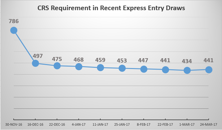 A CRS threshold of 441 means that it is possible that a candidate who is educated at Bachelor's Degree level, and who has no work experience in Canada and no additional points for a provincial nomination, or for a job offer, or for previous study in Canada, could obtain an ITA, assuming that he or she has demonstrated advanced proficiency in one of Canada’s official languages (English or French).