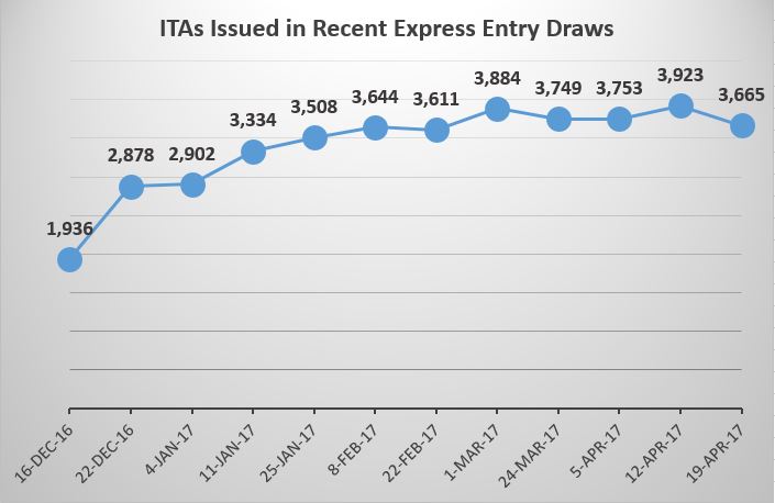 This is the third draw to have taken place so far this month. In total, 11,341 ITAs have been issued over these three most recent draws, and the number of ITAs issued so far this year (35,973) now surpasses the number issued over the entire year of 2016 (33,782).
