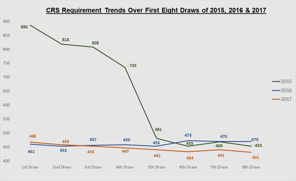 Ultimately, this is what happened through closing weeks of 2016 and into 2017, as the point requirement for a candidate to receive an ITA went from 497 to 434 in just two-and-a-half months. In that time, the CRS threshold reached a new record low on three occasions. In addition, by inviting more candidates IRCC had to reach deeper into the pool — therefore, more candidates were in line to receive an ITA.
