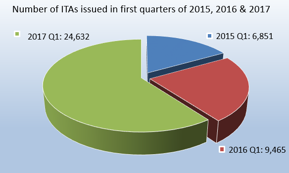 Through the opening three months of 2017, a total of 24,652 Invitations to Apply (ITAs) for permanent residence have been issued by Immigration, Refugees and Citizenship Canada (IRCC), an increase of more than 160 percent on the 9,465 ITAs issued over the first quarter of 2016. For the same period in 2015, a total of 6,851 ITAs were issued.