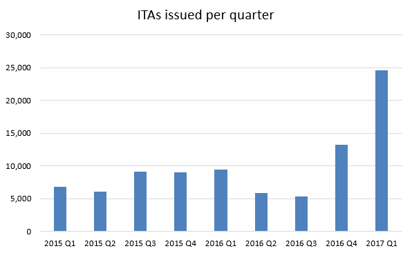 Indeed, the number of ITAs issued to candidates in the pool over the first quarter of 2017 is far greater than during any other quarter since the Express Entry system was first launched in January, 2015.