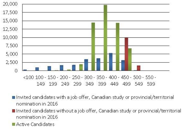 The graph below, courtesy of IRCC, shows candidates in the Express Entry Pool as of January 3, 2017 and ITAs issued in 2016 by core CRS score.