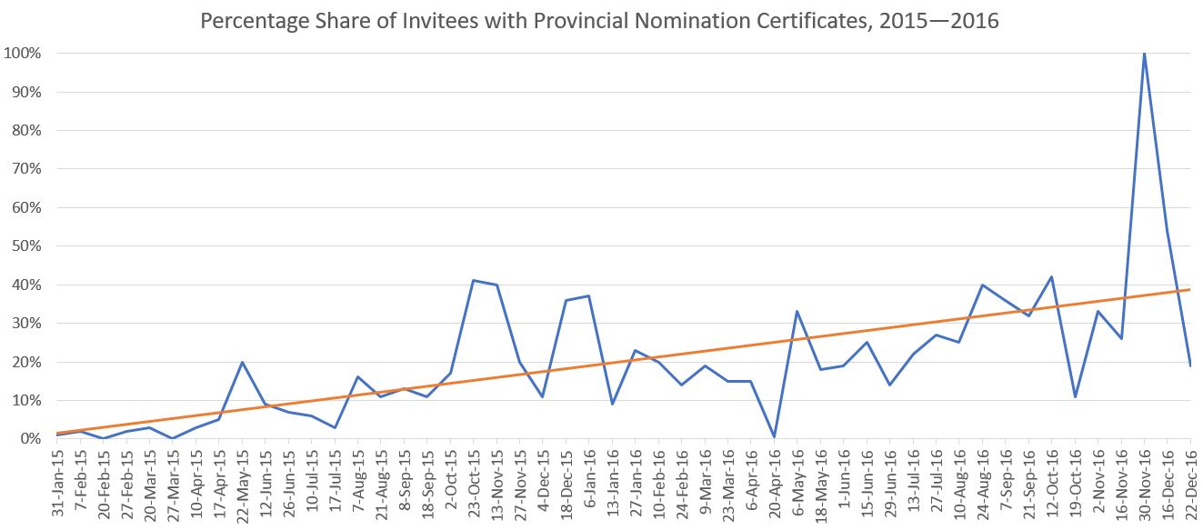 In 2015, around 13 percent of candidates who were issued an ITA had obtained a provincial nomination certificate through an Express Entry-aligned (‘enhanced’) PNP stream. However, through 2016 this share doubled to 26 percent of all invited candidates.