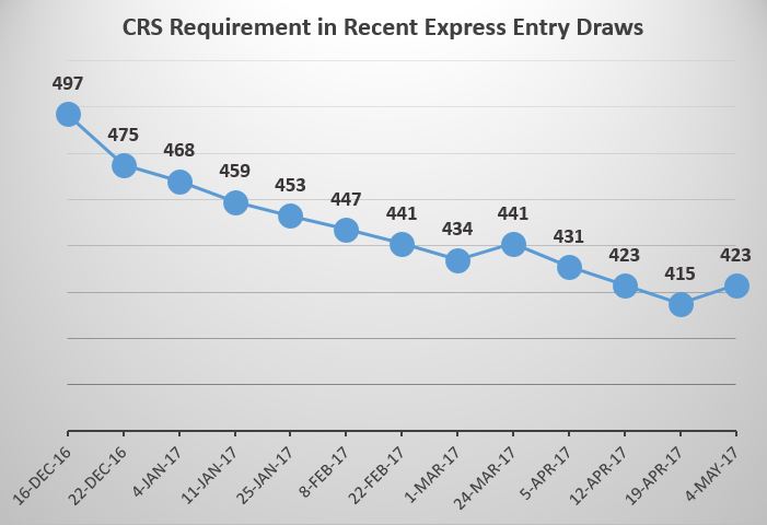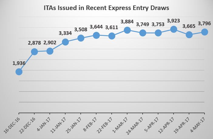 A total of 3,796 candidates in the Express Entry pool for immigration to Canada were issued an Invitation to Apply (ITA) for permanent residence in a draw that took place on May 4, 2017. Each invited candidate this time around had a Comprehensive Ranking System (CRS) score of 423 or higher.