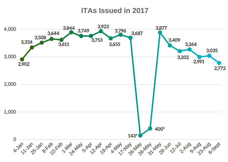 A total of 2,772 candidates were invited this time around, bringing the total number of ITAs issued so far this year to 66,549, far more than were issued in the whole of last year. More than half of all ITAs issued since Express Entry was first launched in January, 2015 have been issued in 2017.