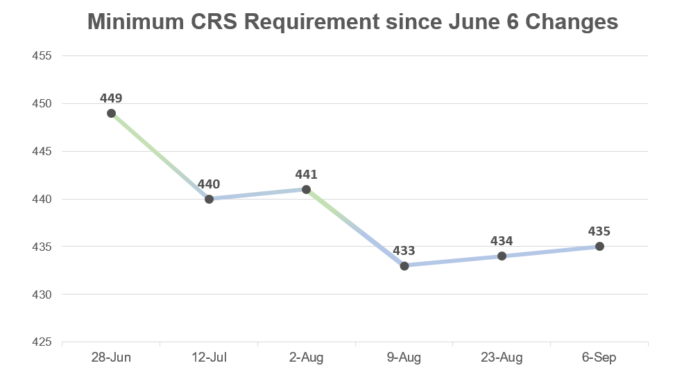 The CRS cut-off threshold of 435 for the September 6 draw is broadly in line with recent draws, which have tended to have thresholds around the mid-430s. Earlier this summer, and following improvements made to the CRS in early June, the thresholds were slightly higher at 449, 440, and 441, respectively, in the first three draws immediately following those changes.