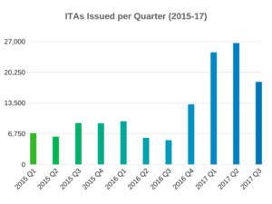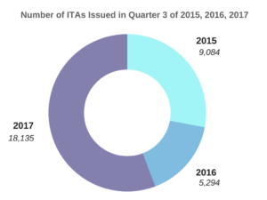 The third quarter of 2017 saw 26 percent more ITAs issued than the sum of ITAs issued in the third quarters of 2015 and 2016. As indicated in the graph below, every quarter of 2017 has witnessed a record-breaking number of ITAs issued in comparison to previous years.