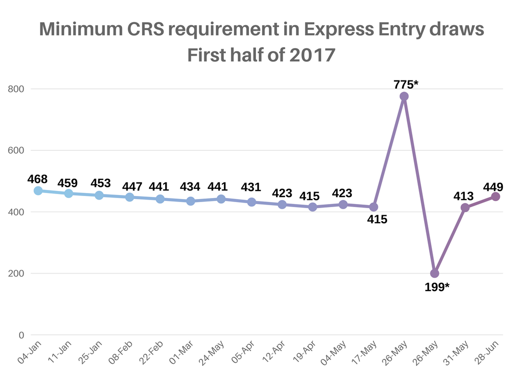 Contributing to the drop in the CRS cut-off scores in 2017 was a change introduced by Immigration, Refugees and Citizenship Canada (IRCC) in November 2016 that reduced the number of points awarded for a job offer to between 50 and 200, down from 600. The impact of this change was evident in the cut-off scores for draws in the first half of 2017, which dropped steadily from 468 on January 4 down to 415 in April and finally 413 in May.