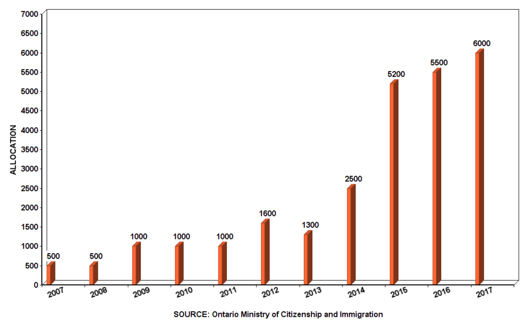 Ontario was allocated 6,000 nominations through Canada’s Provincial Nominee Program for 2017, its highest allocation in a decade. An additional allocation was subsequently received from Immigration, Refugees and Citizenship Canada (IRCC) in December.