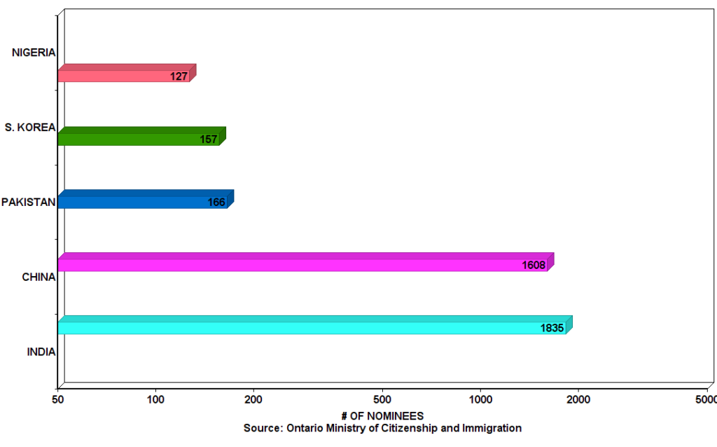 In terms of country of birth, the OINP reported India leading the way with 1,835 nominees as of Sept. 30, 2017. China was a close second at 1,608 nominees.