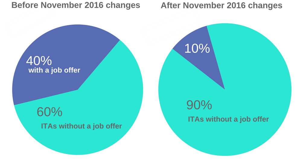 Citizens of India were issued the most ITAs, both before and after the job offer change, with their share jumping by 12 percentage points after the change from 31 per cent of ITAs to 43 per cent. Chinese citizens were second, with 10 per cent post-change. Nigerian citizens placed third, with their share rising by two percentage points to five per cent of all ITAs in the six months after the job offer change in November 2016.
