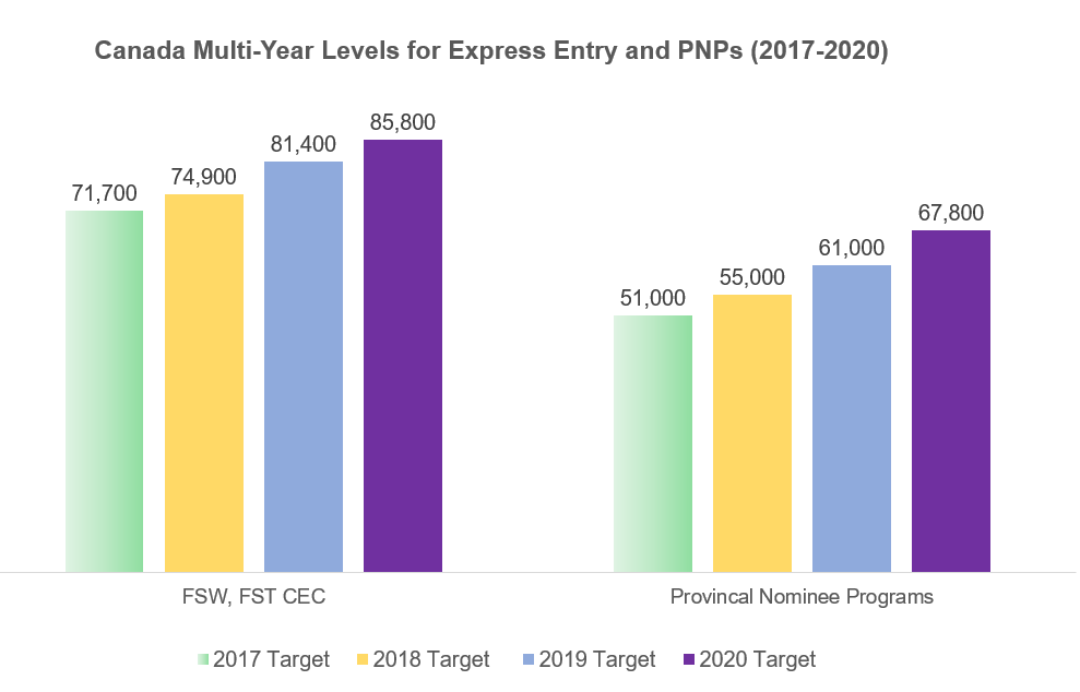 Last November, Canada put aside one-year immigration levels planning in favour of a three-year plan covering 2018 to 2020. The plan calls for a gradual increase in immigration levels over that time, from an overall admissions target of 310,000 in 2018 to 340,000 in 2020.