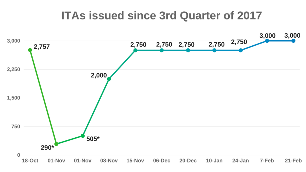 The total of 3,000 Invitations to Apply (ITAs) that were issued in this latest draw is also the same as the February 7 draw. This marks the second consecutive draw in which 3,000 candidates were invited to apply. Both these draws saw the number of ITAs issued increase by 250 over the previous five draws.