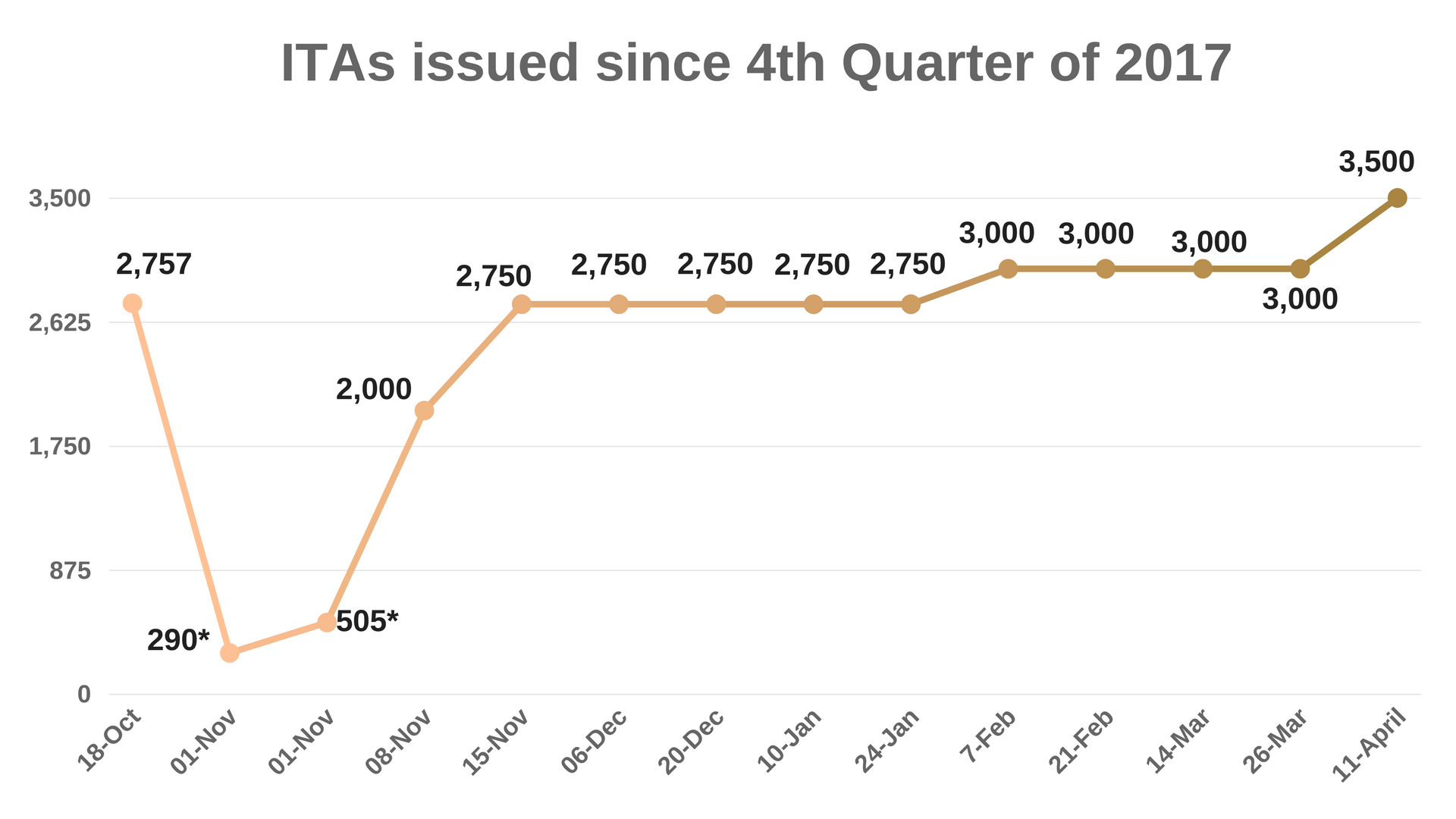 Today's draw broke the recent trend of 3,000 ITAs being issued, which was also the case in the four previous draws going back to February 7. The Government of Canada has issued 21,000 ITAs since the start of 2018.
