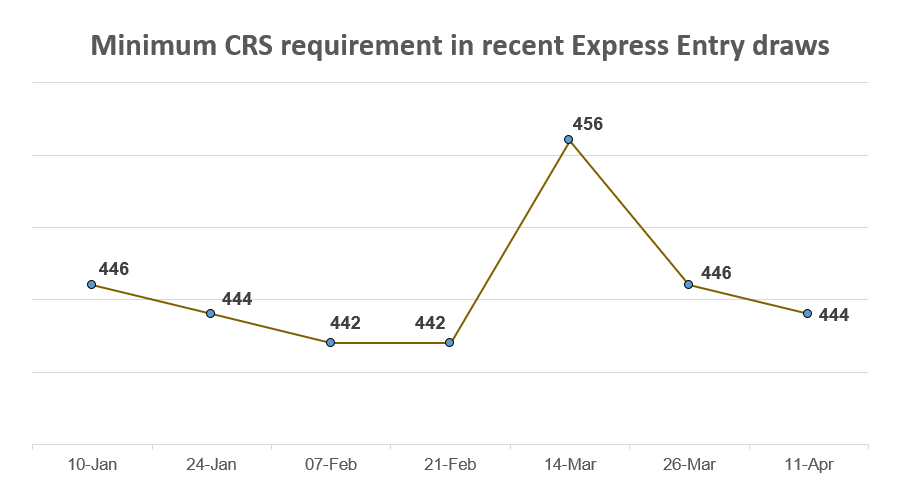 The cut-off score is two points lower than the previous invitation round, which took place on March 26 and had a CRS minimum of 446. The March 26 draw took place 12 days after the previous invitation round on March 14 and saw the CRS cut-off score drop by 10 points over that previous invitation round.