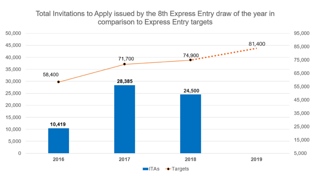 Under its new multi-year immigration levels plan for 2018-2020, the Government of Canada has increased its admissions target for 2018 to 74,900 admissions under the three economic immigration classes administered through the Express Entry system — the Federal Skilled Worker Class, the Federal Skilled Trades Class and the Canadian Experience Class. The admissions target for 2019 is 81,400.