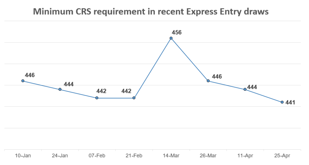The cut-off score for this draw is three points lower than the previous invitation round on April 11, which had a CRS minimum of 444.