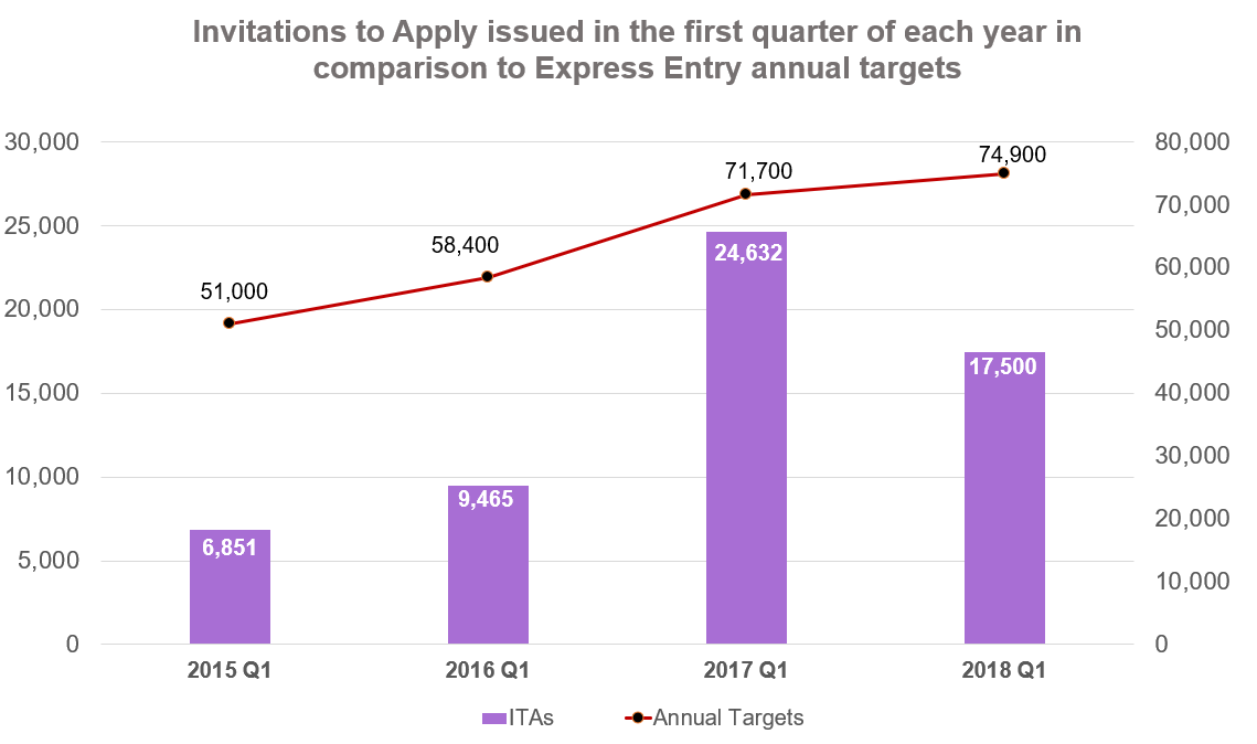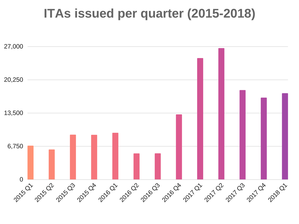 In terms of Invitations to Apply (ITAs), more than half of the quarter’s invitations rounds (four of six) issued 3,000 ITAs each. This was an increase of 250 over the 2,750 ITAs issued in each of the first two draws of 2018. A total of 17,500 ITAs were issued over the course of all six draws, compared to the 20,883 ITAs issued during the first six draws of 2017.