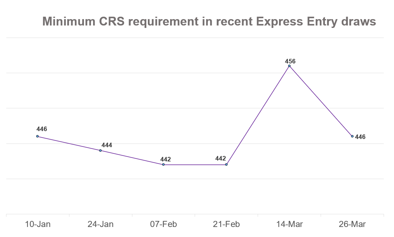 The quarter ended on a good foot with a rare Monday draw on March 26 that saw the cut-off CRS score drop 10 points to 446 over the previous round of invitations on March 14, when the CRS cut-off jumped to 456 after a three-week gap between draws.