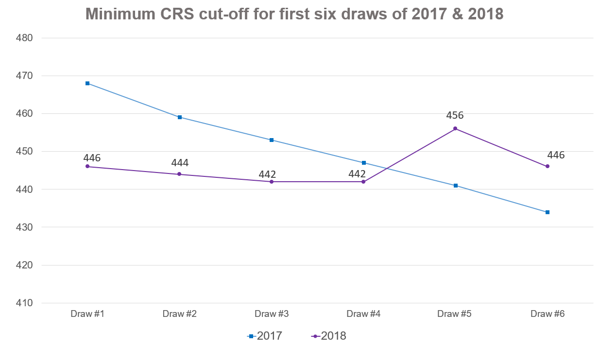 The next three draws of 2018 continued this record low start, with minimum cut-off scores of 444, 442 and 442, respectively, compared to the cut-off scores of 459, 453 and 447 for the second, third and fourth draws of 2017.