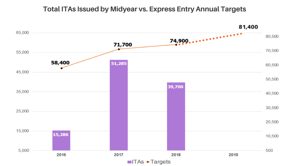 Given the higher admissions targets that IRCC has set for both 2018 and 2019, it was expected that the first half of 2018 would be even busier in terms of ITAs than the record-smashing first six months of 2017, when 51,285 ITAs were issued and the Comprehensive Ranking System (CRS) minimum score in one all-program draw dropped to 413.