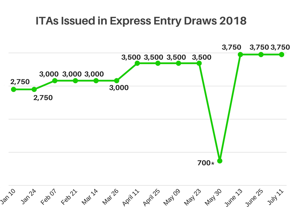 The increase to 3,750 ITAs for both the draws held last month established a new Express Entry record for the month of June. The 7,500 ITAs issued last month more than doubled the 3,409 issued in June 2017.