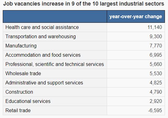 Statistics Canada says job vacancies in B.C. increased in 19 of 20 industrial sectors in the province, with vacancies concentrated in the province's Lower Mainland-Southwest economic region, which includes Vancouver. Sales and service occupations, trades and equipment operators posted the largest increase in vacancies over the first quarter of 2017.