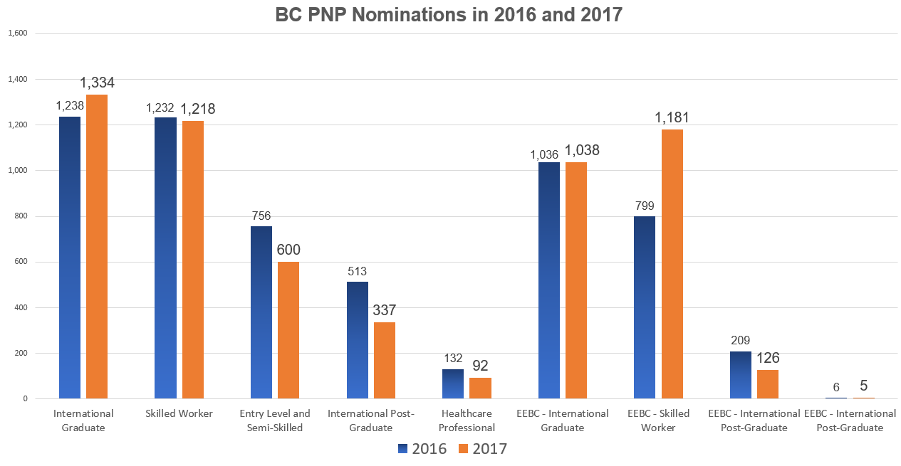 The province of British Columbia nominated 2,350 Express Entry candidates for Canadian permanent residence in 2017, with a notable boost in the number nominated through its EEBC — Skilled Worker category, a new report shows.