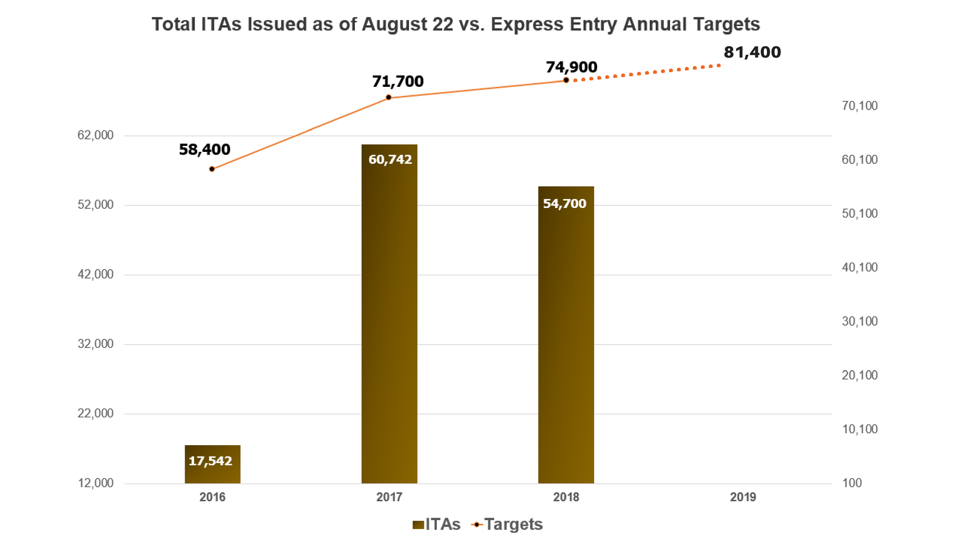 IRCC has now issued a total of 54,700 ITAs over 17 draws in 2018, which puts it slightly ahead of the 54,487 ITAs that were issued over the first 17 draws of 2017. However, IRCC had issued 60,742 ITAs in 2017 by this same point in August, which in that sense puts IRCC 6,042 ITAs behind last year's pace.