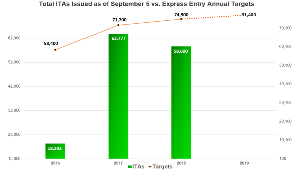 A total of 86,023 ITAs were issued in 2017. Given Canada’s increased admission targets for both 2018 and 2019, it remains possible that this year’s total could surpass the number of ITAs issued in 2017.