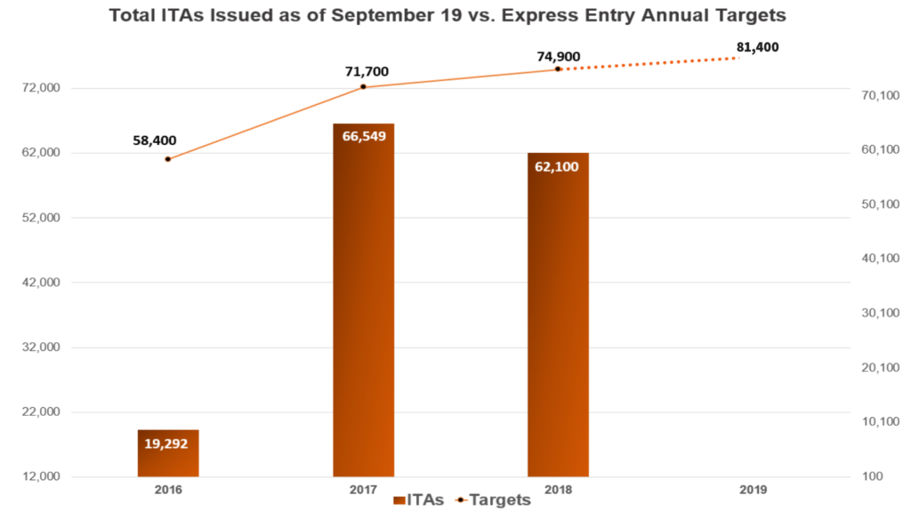 A total of 86,023 ITAs were issued in 2017. Given Canada’s increased admission targets for both 2018 and 2019, it remains possible that this year’s total could surpass the number of ITAs issued in 2017.
