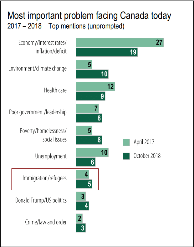 “The salience of immigration and refugee issues as a national problem is low across regions and demographic groups, edging only as high as seven per cent among Quebecers and Canadians with no more than a high school diploma,” the institute found.