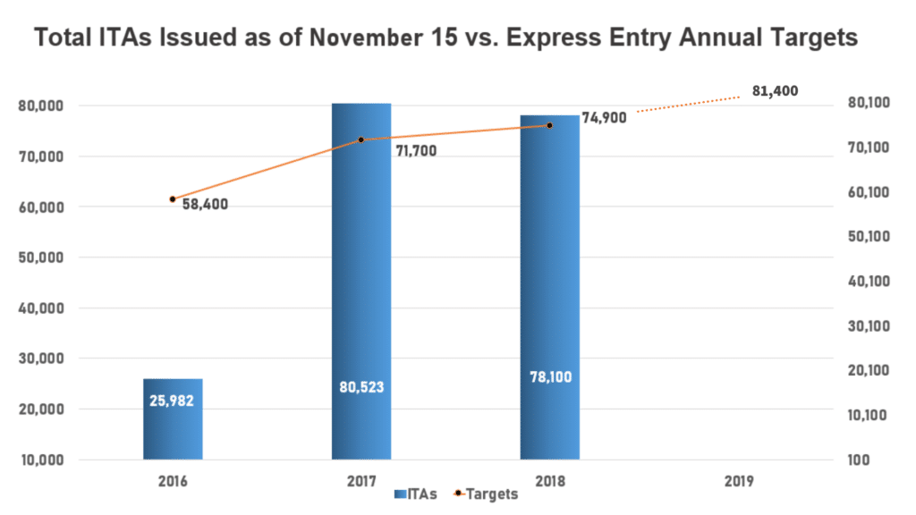 IRCC has a 2018 admissions target for its Federal High Skilled immigration category of 74,900 new permanent residents. This target is slated to grow to 81,400 in 2019, 85,800 in 2020 and 88,800 in 2021 under Canada's updated multi-year immigration levels plan, which the government made public October 31.