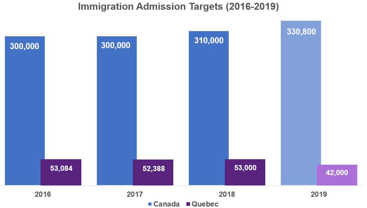 Nationally, the Government of Canada has a target of 330,800 new admissions to Canada for 2019, which is an increase of nearly seven per cent over 2018's target of 310,000.