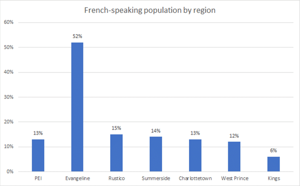 Within the province of PEI, the area with the highest concentration of French-speakers is the Evangeline region at 52 per cent.