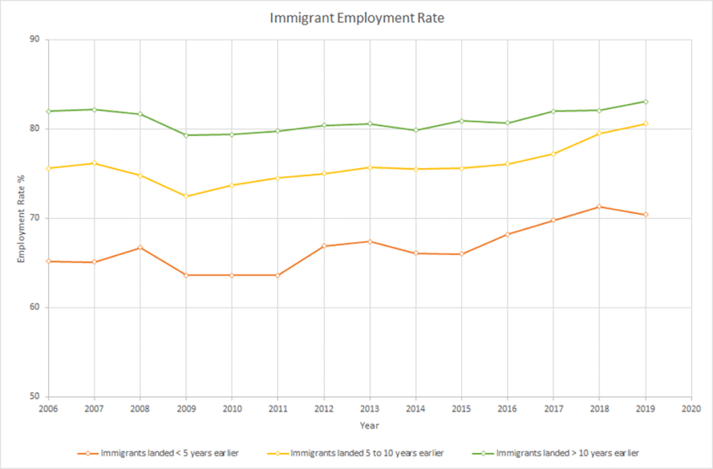 The employment gap between new immigrants and Canadian-born workers is the smallest it has been in a decade. The employment rate gap decreased from 19 percentage points in 2010 to 13 percentage points in 2018.