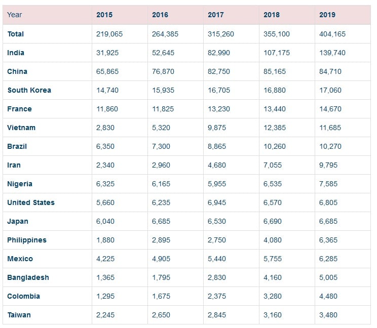 India remains the leading international student source country by a wide margin. In 2019, nearly 140,000 study permits were issued to Indian nationals, representing 35 per cent of all study permits issued.