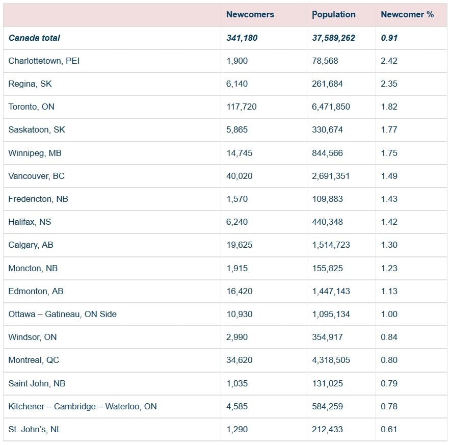 Regina was second, with a share of newcomers also close to 2.4 per cent of its population.