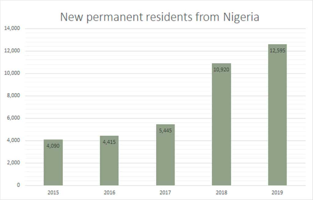 Last year Nigerians were the fourth most represented nationality among new permanent residents. About 12,595 permanent residents in 2019 were from Nigeria, which is exponentially more than the 4,090 Nigerians who became permanent residents in 2015.