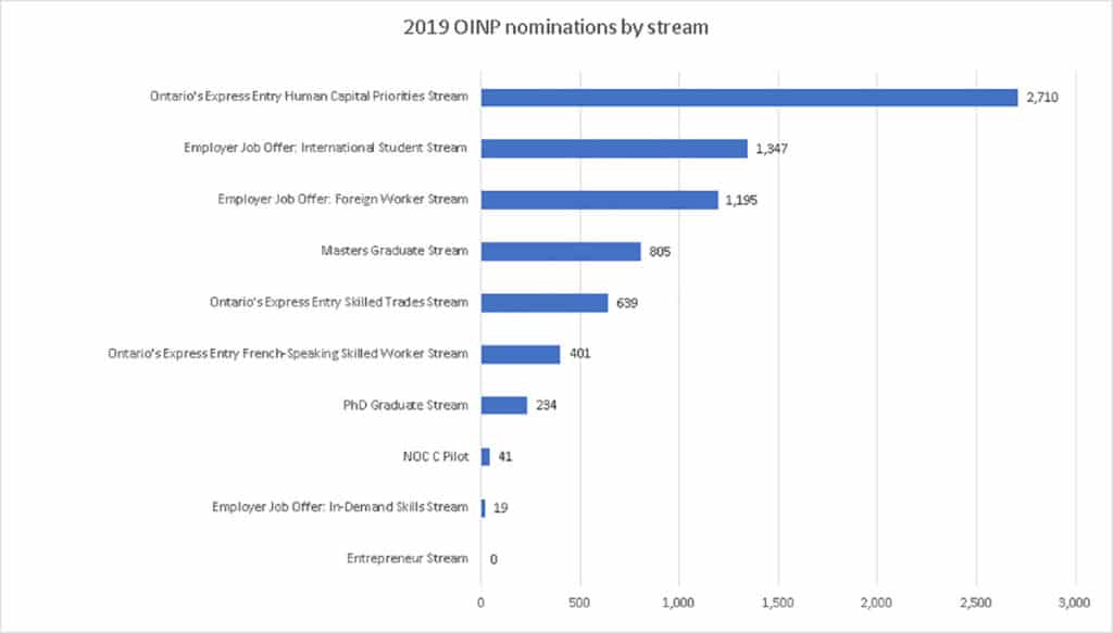 Ontario’s Express Entry Human Capital Priorities Stream brought in the most nominations out of all Ontario Immigrant Nominee Program (OINP) streams in 2019. Nearly 51 per cent of all applicants, or 3,750, were nominated thanks to Ontario’s enhanced streams, which operate in conjunction with the federal Express Entry system.
