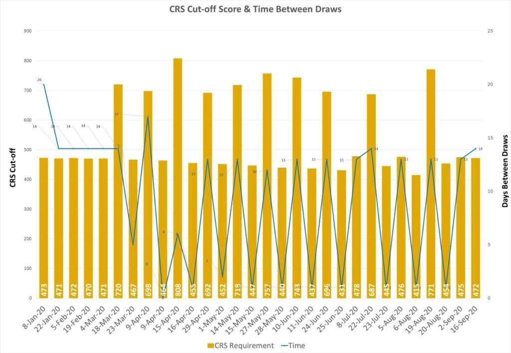 Factors that can affect the cut-off CRS score include the size of the draw (larger draws can produce a lower minimum CRS score) and the time between draws (shorter periods between draws can help to lower the CRS score).
