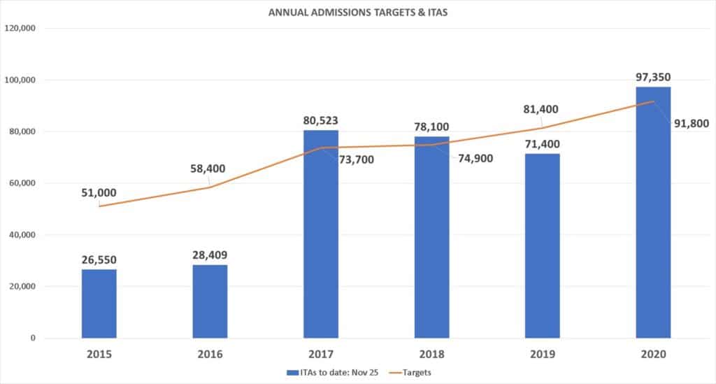 The new draw brings the total number of ITAs issued in 2020 to 97,350. This year is shaping up to be a new record-breaking year for Express Entry, as the number of ITAs issued to date is the highest it has ever been. The previous Express Entry draw saw a record-breaking 5,000 ITAs, and pushed the number of invitations issued this year past the target.