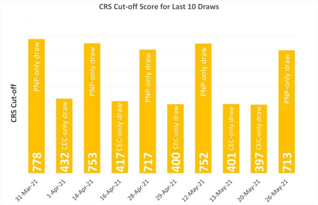 PNP-only and CEC-only draws have vastly different CRS requirements. This is because PNP candidates have a 600-point award attached to their score. CEC candidates are invited in high numbers, and they are not competing for invitations from other programs. The larger the draw size allows for more top-scoring candidates to receive invitations, therefore a lower CRS cutoff. In the previous CEC-only draw, the CRS requirement dropped to 397.