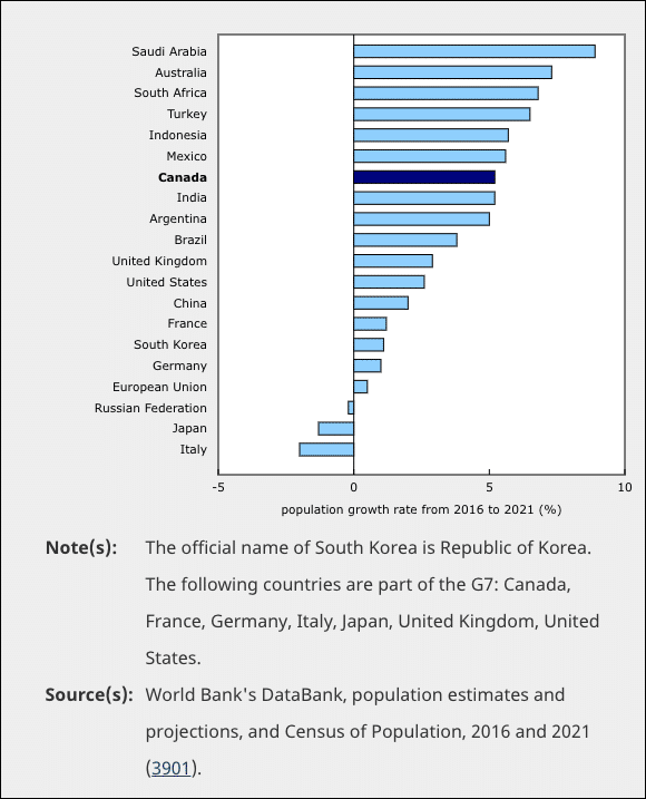 population growth rate from 2016 to 2021 (%) Saudi Arabia 8.9 Australia 7.3 South Africa 6.8 Turkey 6.5 Indonesia 5.7 Mexico 5.6 Canada 5.2 India 5.2 Argentina 5.0 Brazil 3.8 United Kingdom 2.9 United States 2.6 China 2.0 France 1.2 South Korea 1.1 Germany 1.0 European Union 0.5 Russian Federation -0.2 Japan -1.3 Italy -2.0